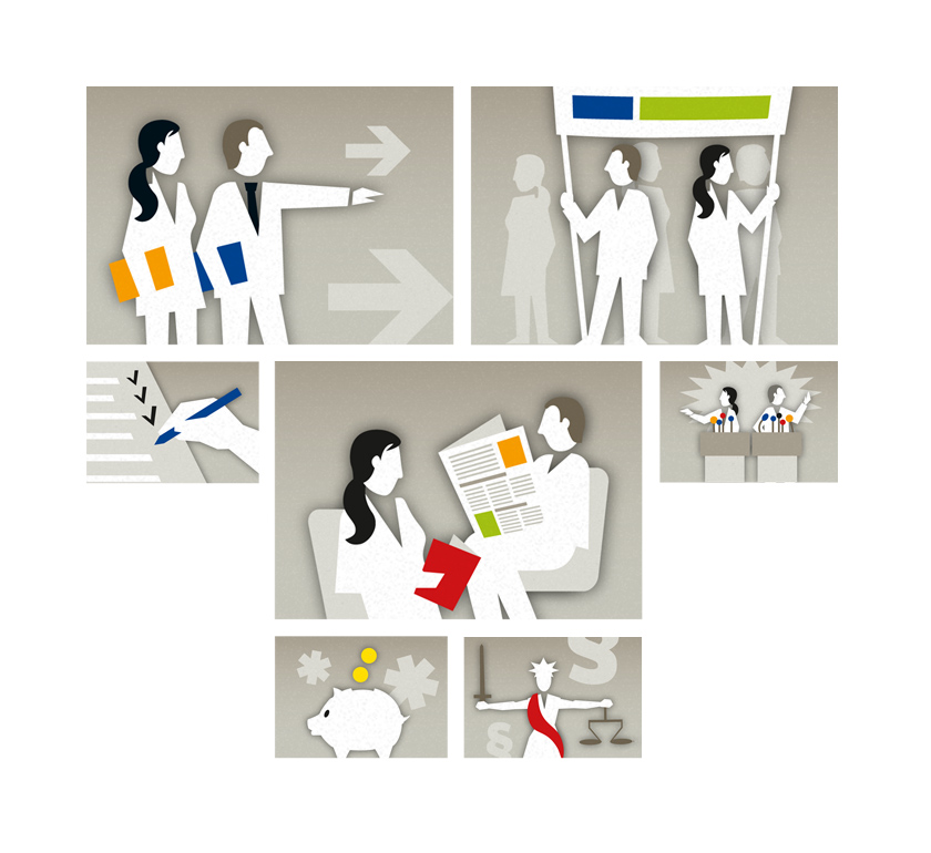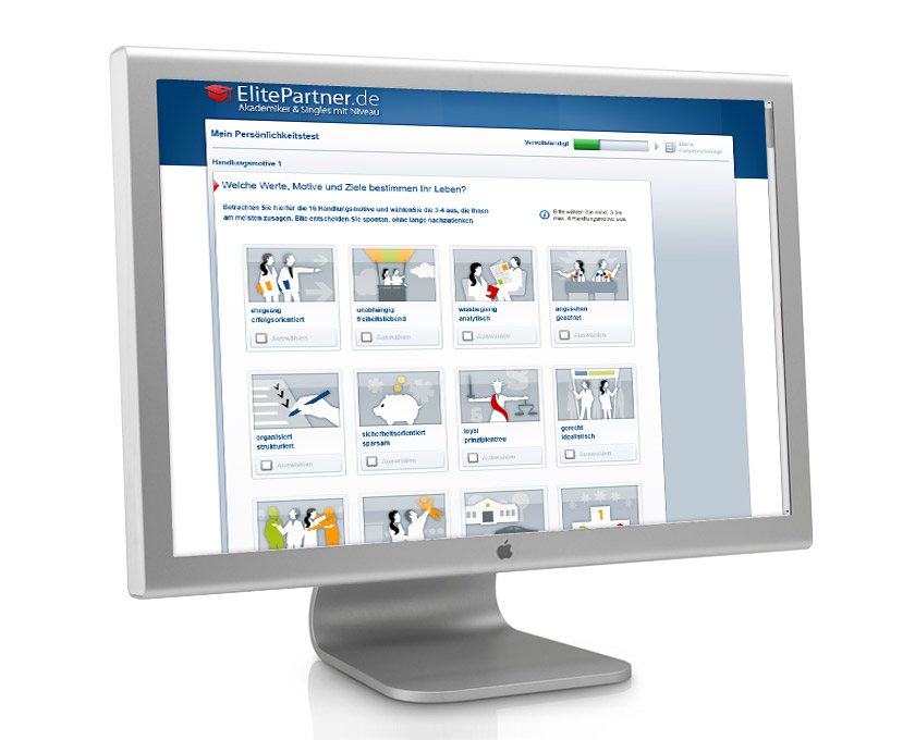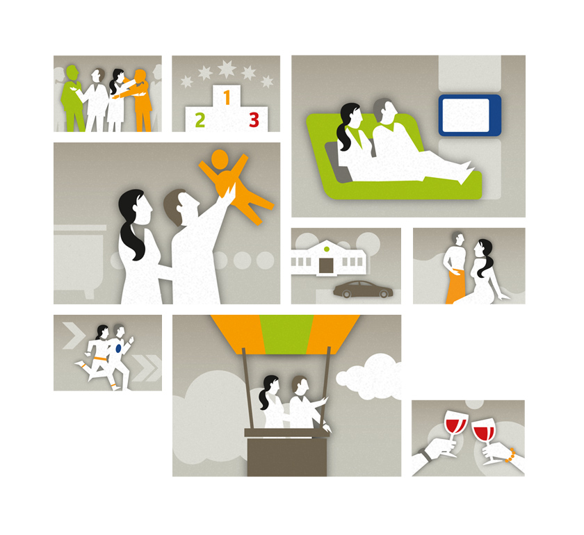 | Enticklung verschiedener plakativer Grafiken für die Profilerfassung der Partner-Vermittlung Elitepartner. Im Auftrag von brink & martens. | |