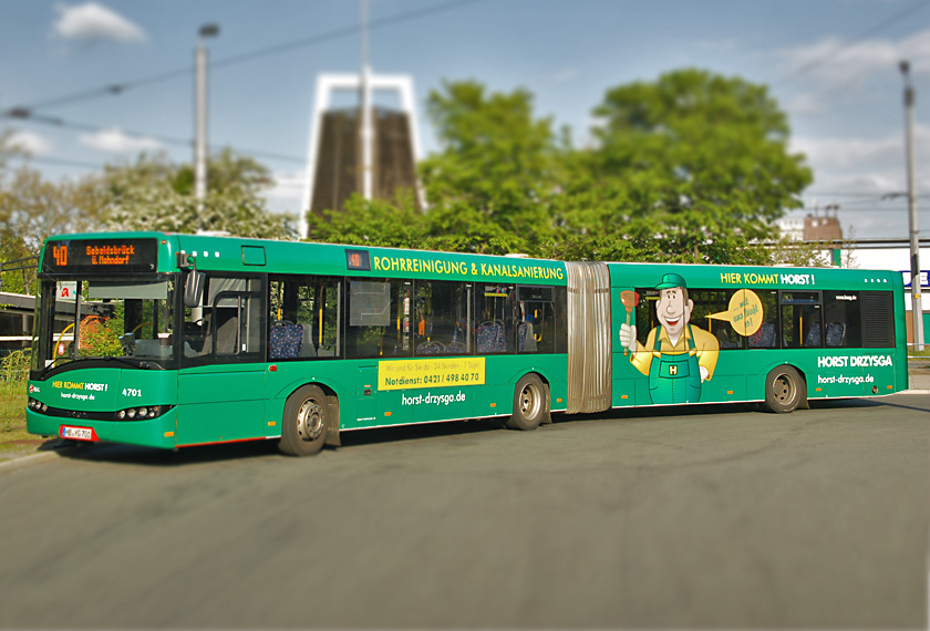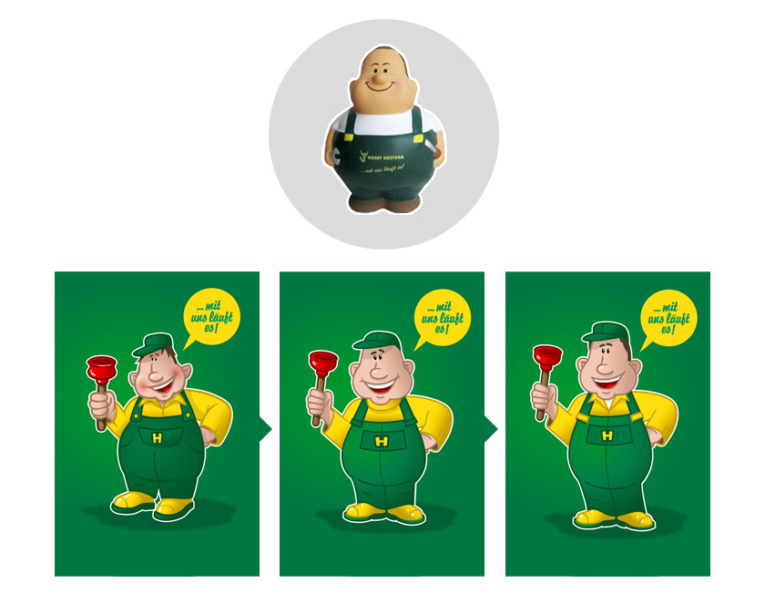 | Entwicklung einer Figur, die sowohl als kompetenter Fachmann, wie auch als sympathischer Ansprechpartner und Gesicht des Unternehmens funktioniert. In vielen Einzelschritten und in enger Abstimmung mit dem Kunden wurde die Figur ausgearbeitet. Inzwischen wird sie auf unterschiedlichsten Materialien, Firmenfahrzeugen und Bussen eingesetzt. | |