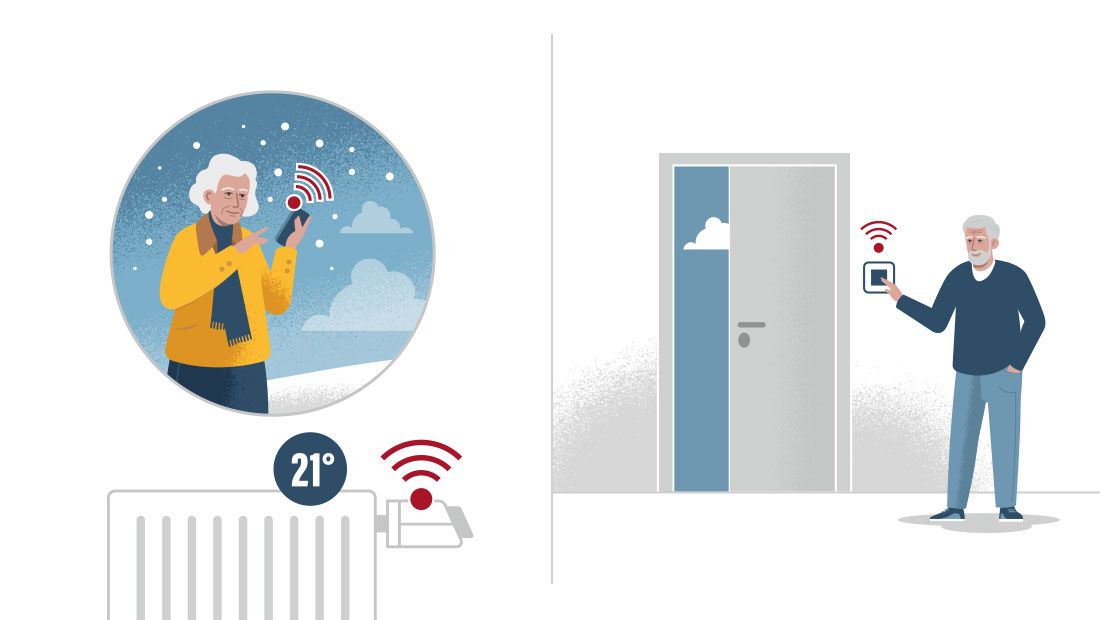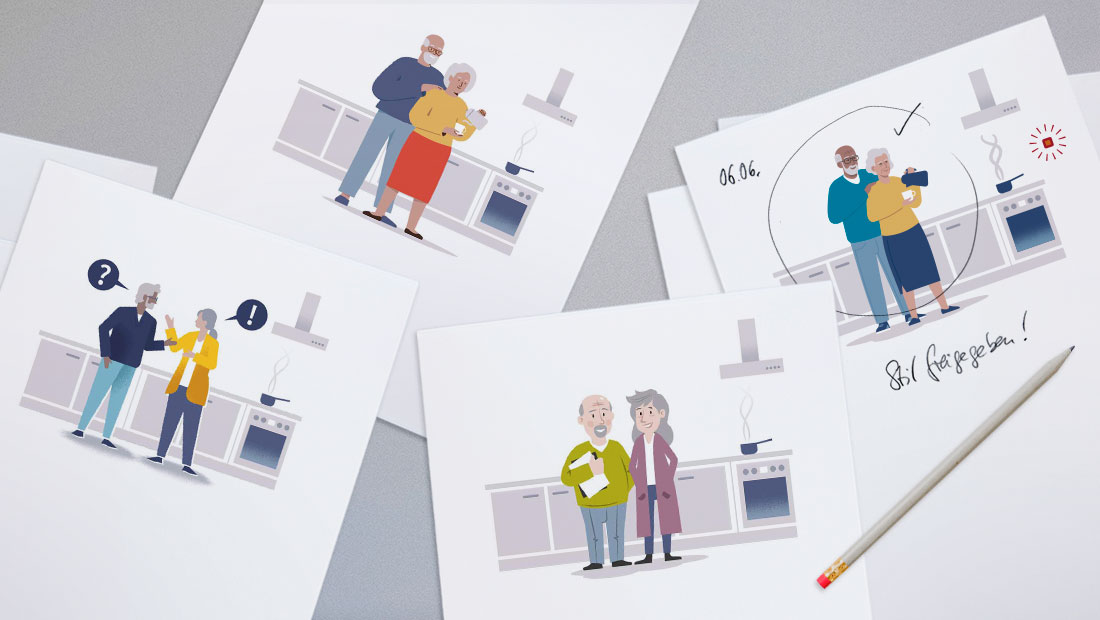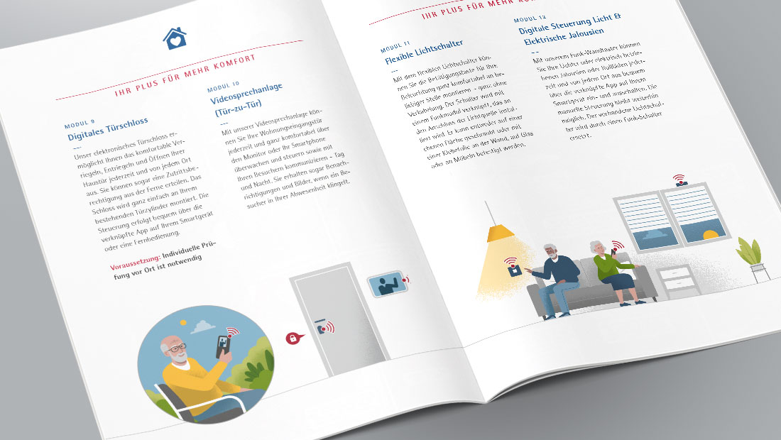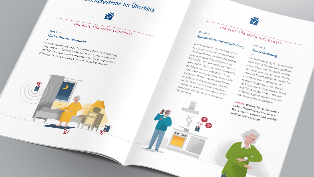 Die Bremer Heimstiftung bietet technische Assistenzsysteme an, die Senioren mehr Komfort und Sicherheit im eigenen Zuhause ermöglichen. Die Herausforderung bei diesem Projekt lag darin, komplexe Technik verständlich und einladend zu vermitteln, ohne dabei auf stereotype oder passive Darstellungen von Alter zurückzugreifen. In flächigen Vektorgrafiken habe ich zusammen mit der Agentur Medienfeld aus Worpswede, verschiedene Alltagsszenarien entwickelt, die zeigen, wie selbstverständlich sich die Systeme in den Alltag integrieren lassen. Die Figuren sind bewusst aktiv und modern gestaltet – Senioren, die Technologie nutzen, um ihr Leben komfortabler zu gestalten. |